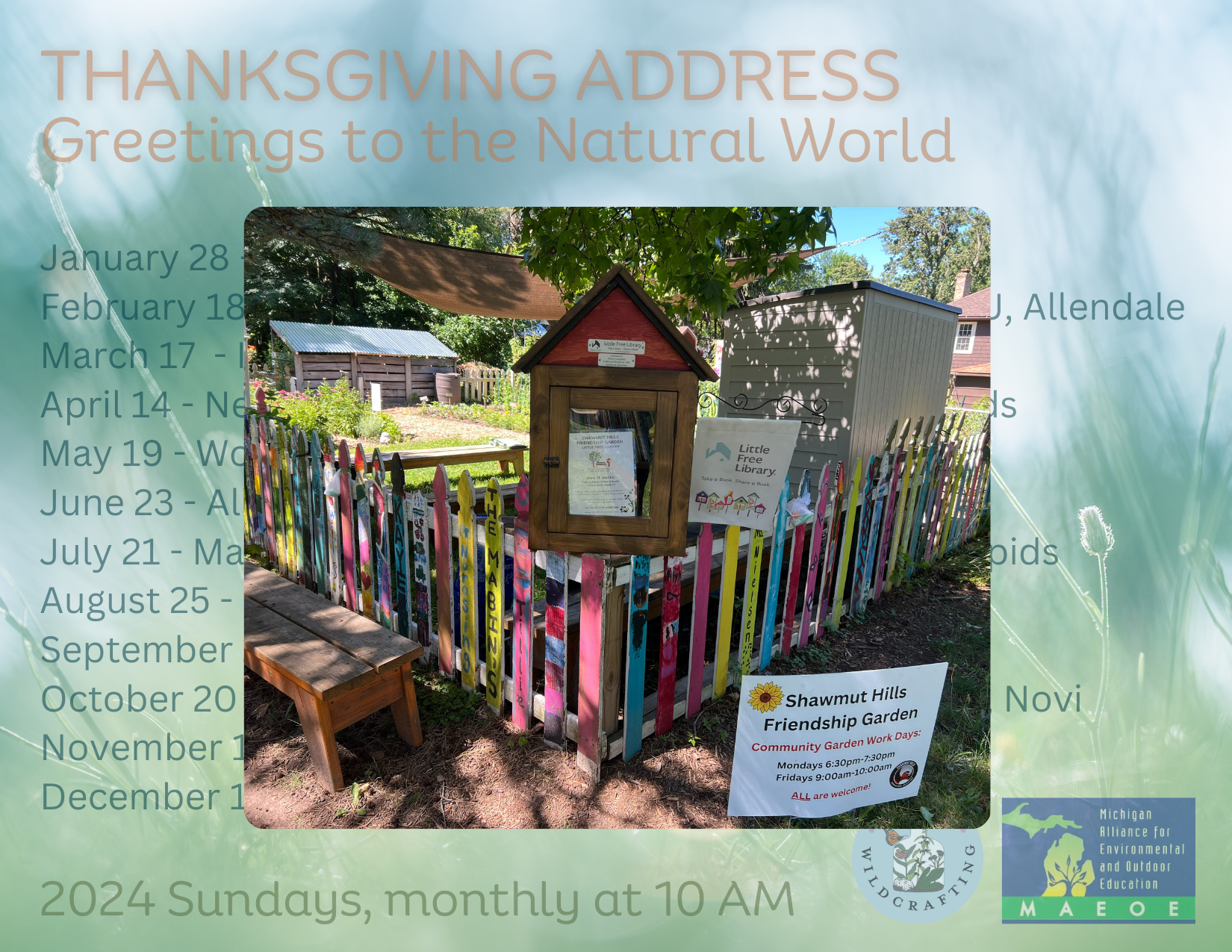 The purpose of these monthly gatherings is to experience a way of acknowledging the Natural World, greeting all living things, and showing gratitude. This practice is encouraged by the Haudenosaunee to be shared widely, as written by John Stokes, that we “share in these words, that our concentrated attention might help us rediscover our balance, respect, and oneness with Nature.”
