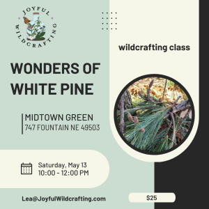 White pine has many gifts if you know how to access them. Come experience the wonders of Michigan’s state tree–a gem of our place. Together we’ll take a deep dive into the wonders of White Pine. We’ll sample vinegar, tinctures, oil, salve, cookies, beverages and more. You’ll have an opportunity to work with this lovely plant on site, giving you the confidence to recreate its gifts on your own.    BRING: A method for taking notes and pictures, a chair or blanket for sitting  COST: $25 RESERVE YOUR SPOT TODAY! Email Lea pay and register for this event FACILITIES: There’s not a bathroom facility at this park